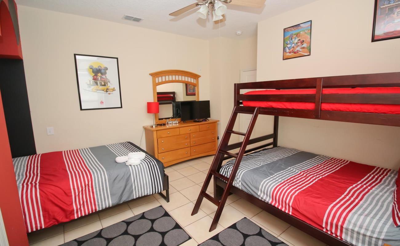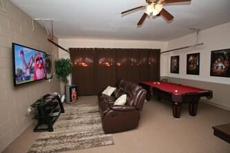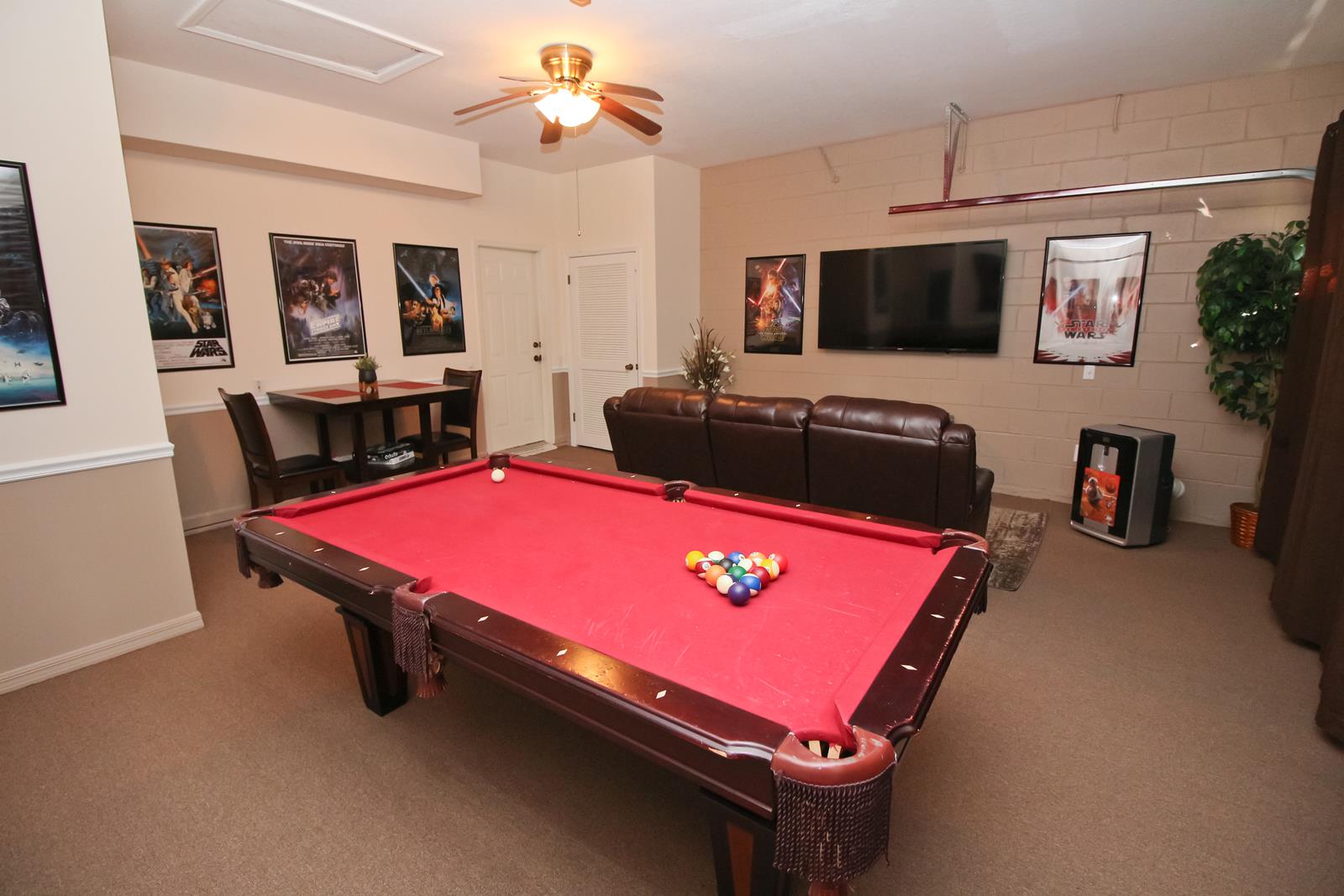 This non-smoking home features a large king bedroom with ensuite, Queen bedroom, and a special Mickey room which features a full size bed plus a bunk bed. The home comes equipped with everything you need for a stress-free vacation including dishes, towels, and appliances all for your use. There are TVs in every room including the giant 65 inch in the enhanced Star Wars themed game room. Tile throughout means you will experience a clean and low allergen environment. The wide entry and no stairs throughout make the property wheelchair accessible. The pool at this home offers privacy with its hedge on both sides of the house. Finally, take advantage of the available resort style amenities with a short walk (2 blocks) to the expansive sun deck and pool with water feature, spa, arcade, theater, playground, tennis and basketball courts, and so much more! This home is minutes away from Disney and a short drive to other attractions such as Universal Studios, Sea World, Lego Land, Water Parks, beaches, airport and so much more. We invite you to stay at one of the best values in the Orlando area. Your own private vacation get-away. Please note: A $30 per day pool heat fee would be incurred for guest with pool heat service. Contact owner to add service. Sorry no pets.