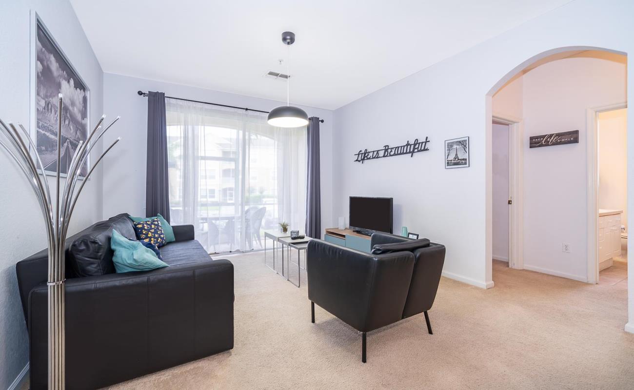 The space Kick-back in comfort and style in our 3-bedrooms condo located in the beautiful and popular Windsor Palms Resort. This fun family vacation resort is just minutes from Walt Disney World and all the major Orlando theme parks and attractions. This beautiful condo sleeps 6; the master bedroom has a king size bed and an ensuite bathroom; the second bedroom has a full size bed and adjoining full-size bathroom, and the third bedroom has 2 twin beds and adjoining full bathroom. 2 bedrooms have TVs. The living room has a comfy sofa and a 42' flat-screen TV. The dining table seats six. Our kitchen is fully equipped with stove, refrigerator, dishwasher, microwave, blender, coffee maker, toaster, kettle, pots and pans and all the dishware and utensils necessary for making simple or complex meals. Also available is a full-size clothes washer and dryer. We can provide a highchair or a Pack N Play fold out crib UPON REQUEST. This ground floor condo is 1,208 sq ft with a private screened-in patio is a short 2-3 minutes' walk to the clubhouse and pool and free parking is available immediately outside the condo.